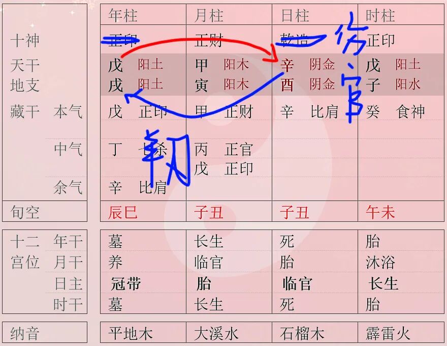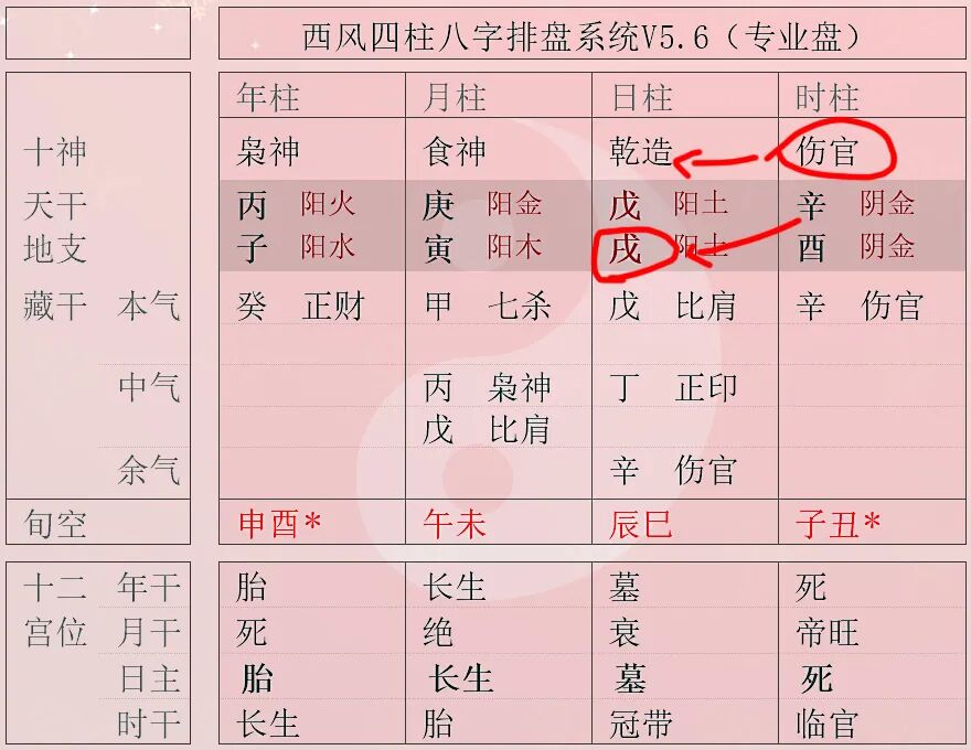 禄命法要以年为主看命,而不是子平法的以日为主。为了让大家看的更清楚,我将这个排盘转换为子平法的以日为主,即将戊戌年变为戊戌日,时辰变为辛酉。我们可以看到,在下图中,日主被时干又伤又刃,所以形成了“羊刃相蚀”。