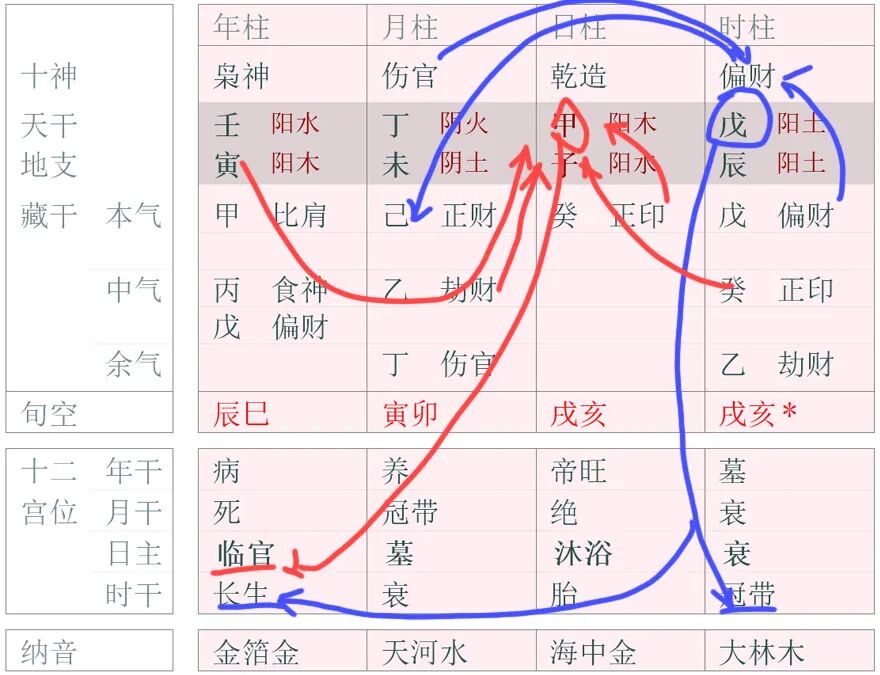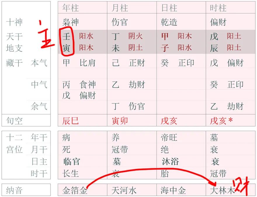 壬寅金为什么不能克制戊辰木?我们就要看纳音在地支的长生十二宫了。壬寅金箔金,金在地支寅的长生十二宫为“绝”,所以这个金箔金为“绝地之金”,为衰金。戊辰大林木,木在辰为“冠带”旺地,为旺金。所以,衰金克不了旺木,“身衰不能克财”。