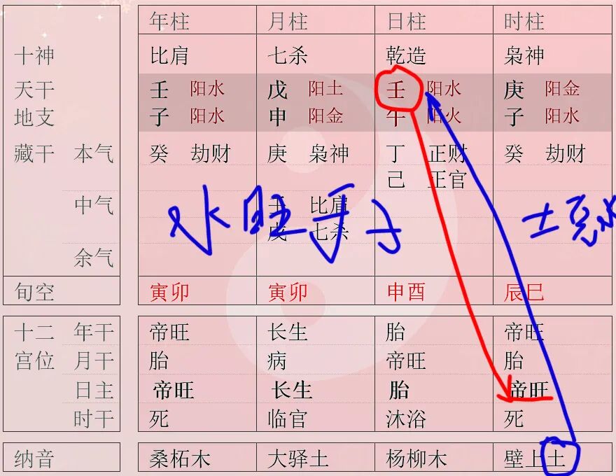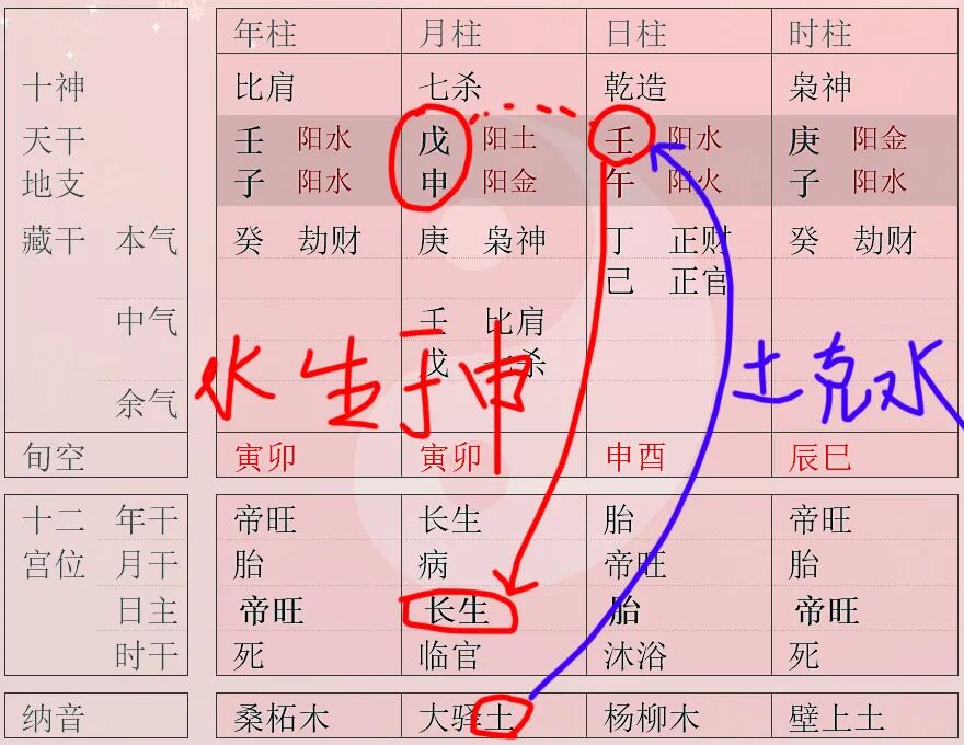 上面的图片中,日主壬水,长生于申,所以叫做“壬水生于申”,但戊申的纳音为土,却克了日干壬水。壬水虽然长生于申,但是却被戊申纳音所克,所以虽然壬水在戊申为“生而不生”,“遇喜反忧”。