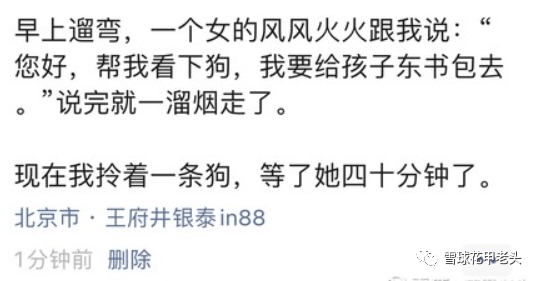 昨天早上发了个状态,说的是遛弯的时候,一个女人风风火火走过来跟我说:“您好,帮我看下狗,我要给孩子送书包去。”说完一溜烟走了,当时一切发生都是在电光火石之间:走过来,交给我,一句话,转身走,一气呵成。