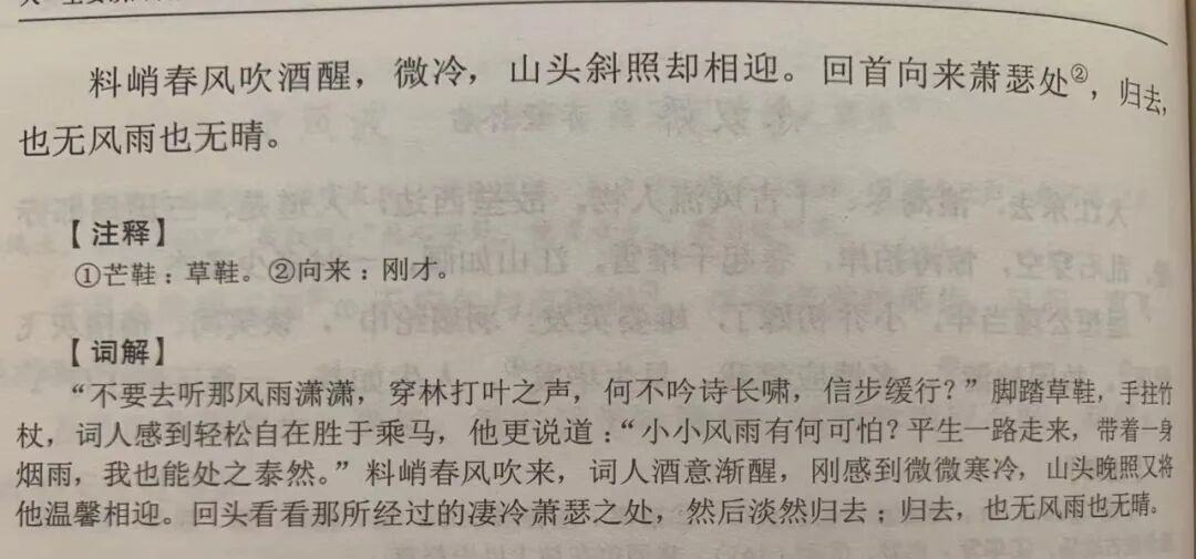料峭春风吹酒醒,微冷,山头斜照却相迎。回首向来萧瑟处,归去,也无风雨也无晴。