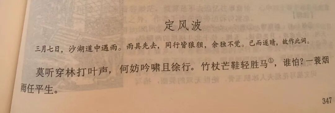 莫听穿林打叶声,何妨吟啸且徐行。竹杖芒鞋轻胜马,谁怕?一蓑烟雨任平生。
