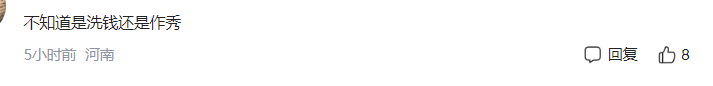 比如:“最后再坑下一笔。”再比如“世界上最大的骗局。”、“怎么就没人请我吃饭还给我送钱的呢?人比人气死人呀”、“不知道是洗钱还是作秀”。等等。