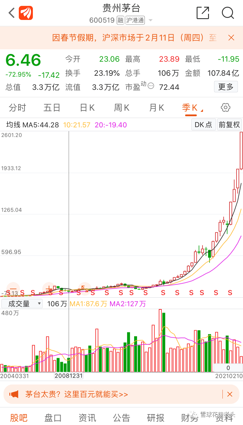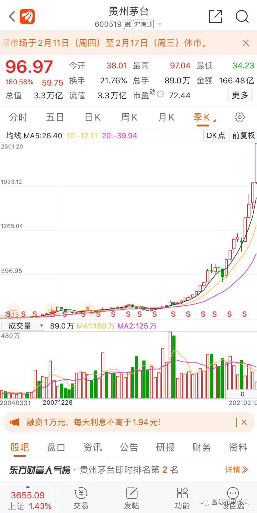徒弟给我发了两张截图,问我当年的感受,我的思绪还真的是带回去那个时候,可是只能想起来个大概,很多事情都是模糊的,包括茅台的最低的是不是只有6块钱。反正我自己账户是亏了60%左右,也补仓,但是遥遥无期。