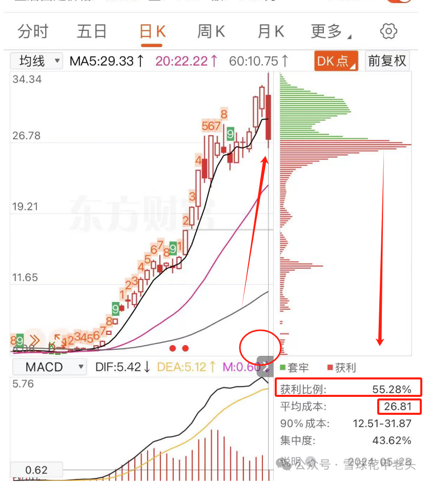 大家可以直观去看,价格一路攀升,但是持仓成本也是一直上升,说明换手率和新进来的人很多,他们的成本都挺高的。