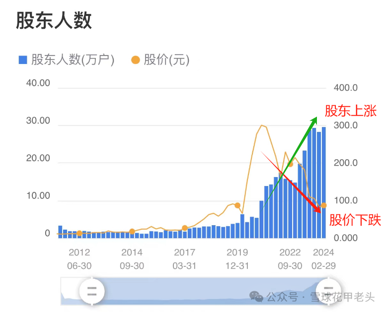 所以,说回白马,大家也就理解了,股价是一路下跌,但是股东人数是一路上涨。
