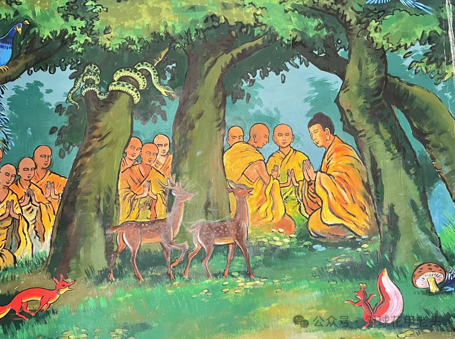 壁画中不仅有佛祖的弟子在听,还有小动物和植物,感觉万物皆有灵性一般。