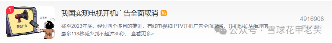 1、今天有个热搜第一,说要实现有线电视和IPTV开机广告全面取消,我记得这个事情之前反复有人吐槽,有明星也有相关媒体。