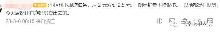 我有一位读者,在微博下面给我留言,原话是:小区楼下现炸油条,从 2 元涨到 2.5 元。 明显销量下降很多。 以前都是排队等,今天居然还有炸好没卖出去的。