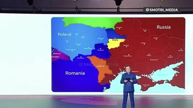 地图上的乌克兰,只是一片位于基辅附近的内陆领土,其面积虽大,但却被俄罗斯、波兰和罗马尼亚瓜分。而俄罗斯,则完全掌控着乌克兰的东部、南部和黑海海岸线。这个画面,就像是一个寓言,暗示着俄罗斯希望与别国共同瓜分乌克兰的野心。