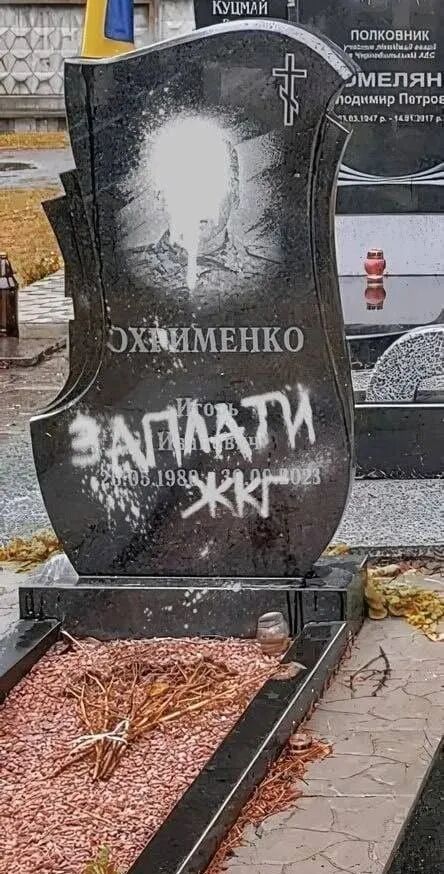 破坏者们在这位战士的墓碑上肆意涂画,奥赫里缅科的头像被涂得面目全非。他们甚至在他的墓碑上潦草地写下交水电费啊!这几个字,仿佛在责问这位已经离世的战士,为什么他生前不能及时缴纳水电费。