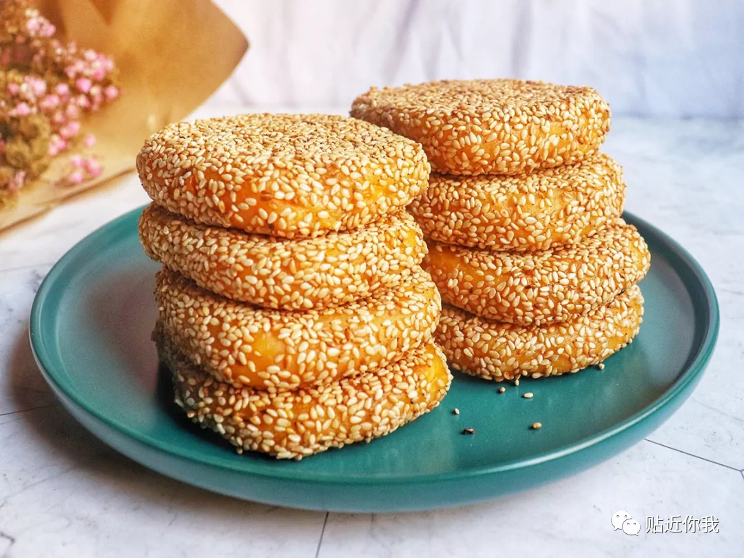 5.用油刷蘸取一些冷水,刷在小饼的表面,然后点缀上一些黑芝麻,为了确保黑芝麻能够紧密附着在小饼上,可以用小勺轻轻摁压一下。