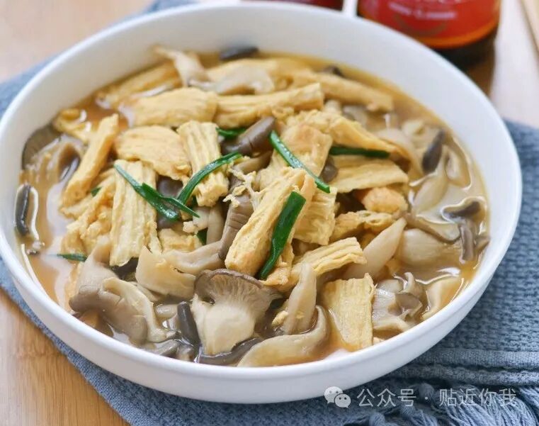 根据个人口味加入适量的盐,搅拌均匀,继续用小火炖煮一段时间,确保所有食材都充分入味,炖好后,将腐竹炖平菇装入碗中,撒上一些青蒜段进行装饰。