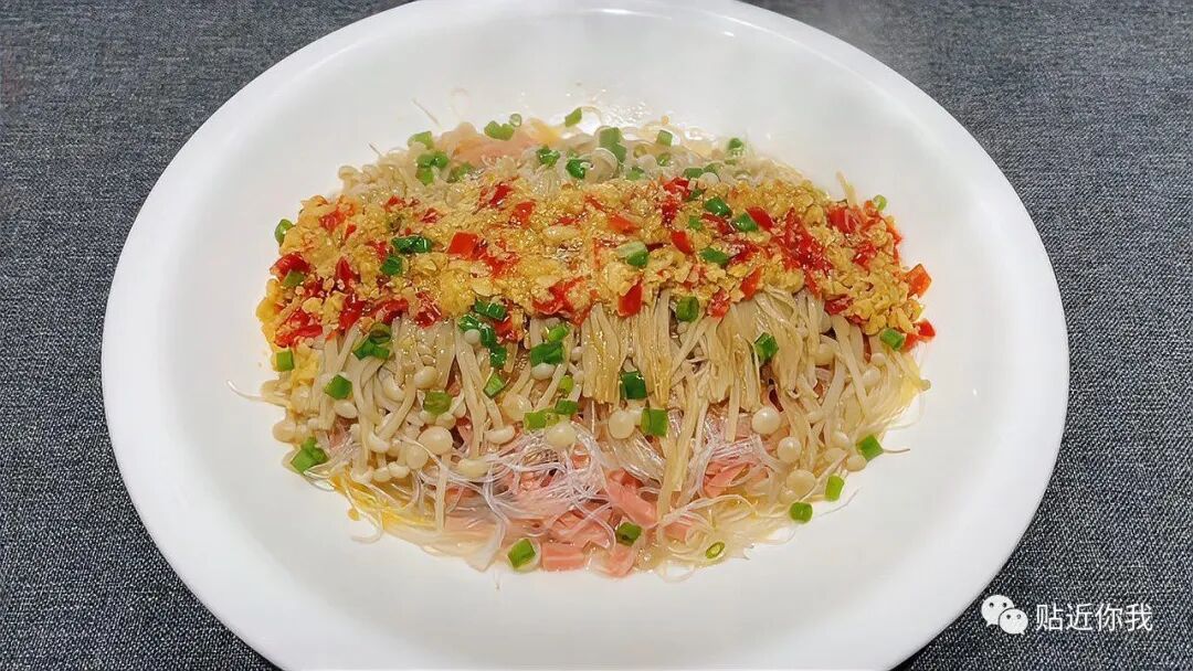 这道菜汇聚了粉丝的柔软口感、金针菇的清香味道以及蒜蓉调味汁的香脆,美味而不失营养,是冬季餐桌上的一道健康素菜。