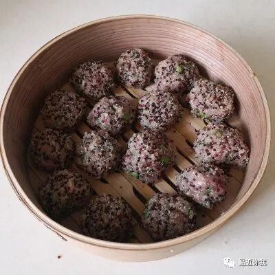 3.蒸熟:将肉丸放入蒸锅中,注意在蒸锅上放一些防粘的食品,避免肉丸粘在蒸锅上,大火蒸上十五分钟,肉丸变得鲜嫩可口,藜麦外酥里嫩。