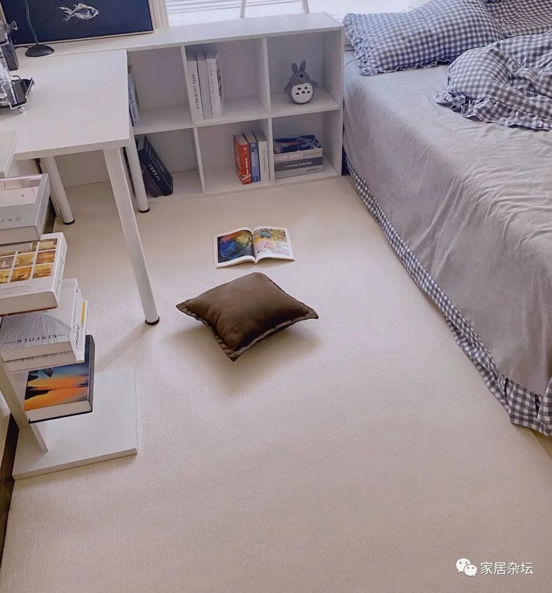 铺地毯,有的是在床头或者床边铺一小块地毯。但是,还有一种做法,就是除了床底下以外的区域都铺地毯。