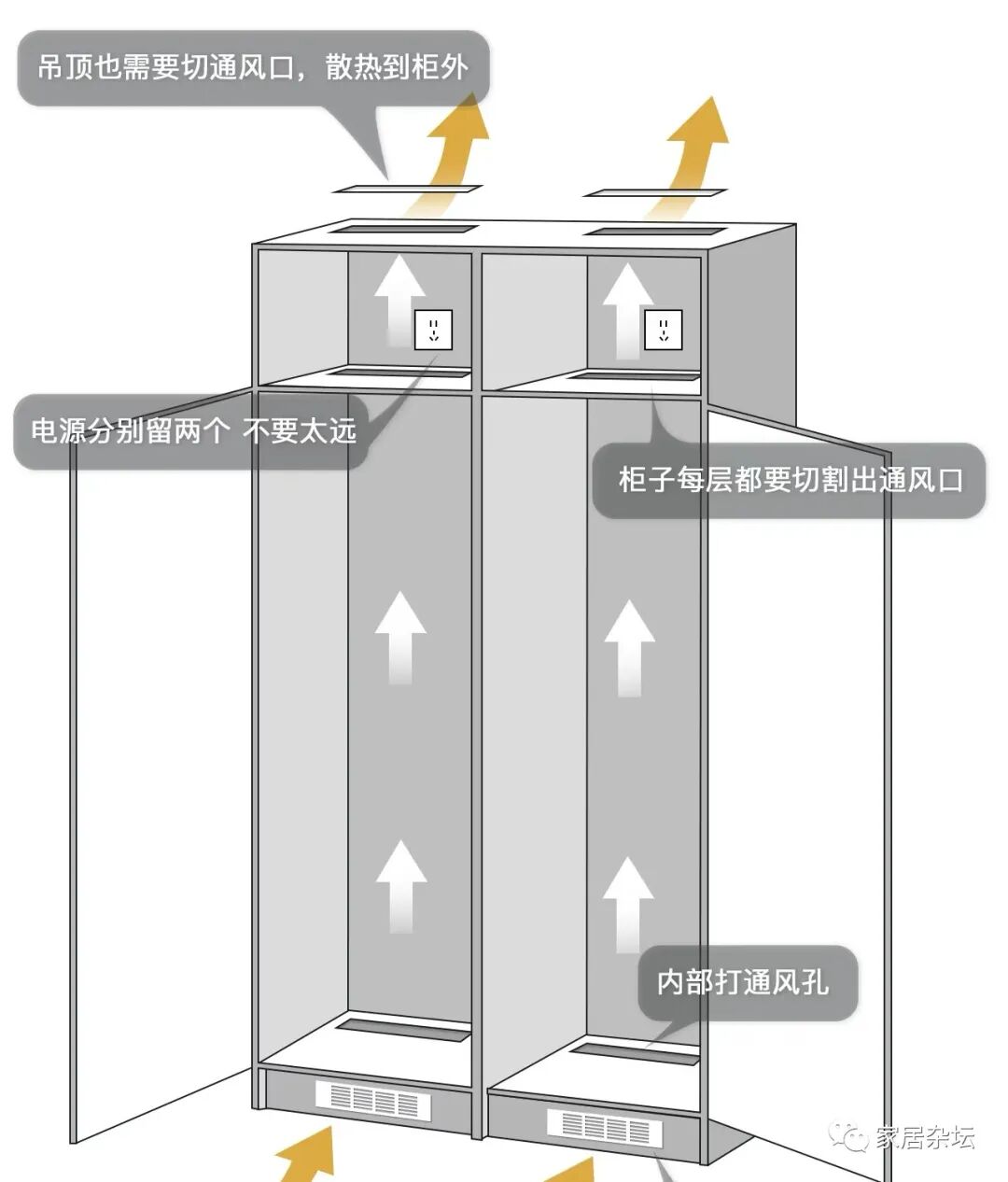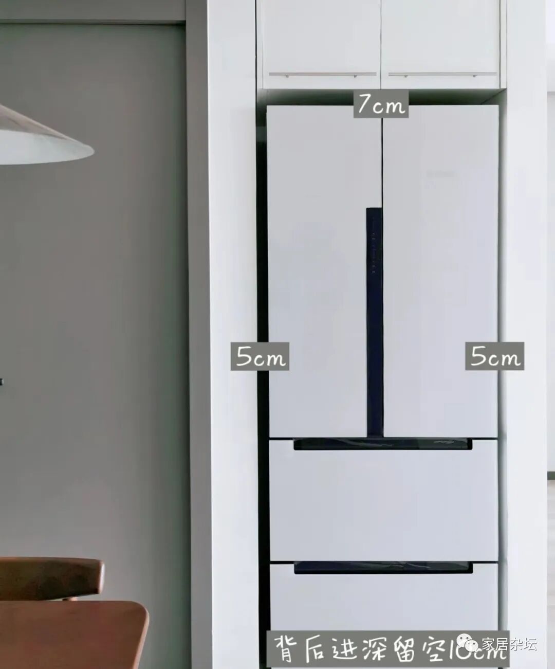 ②、如果是普通的冰箱做嵌入式,那么建议大家要考虑好冰箱的散热。例如是顶部散热,要让冰箱上部至少留出来20cm的空间。