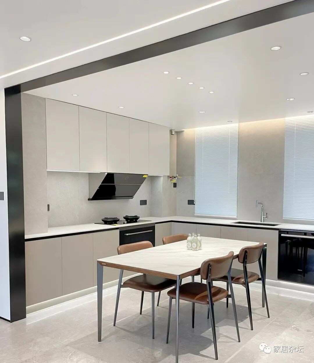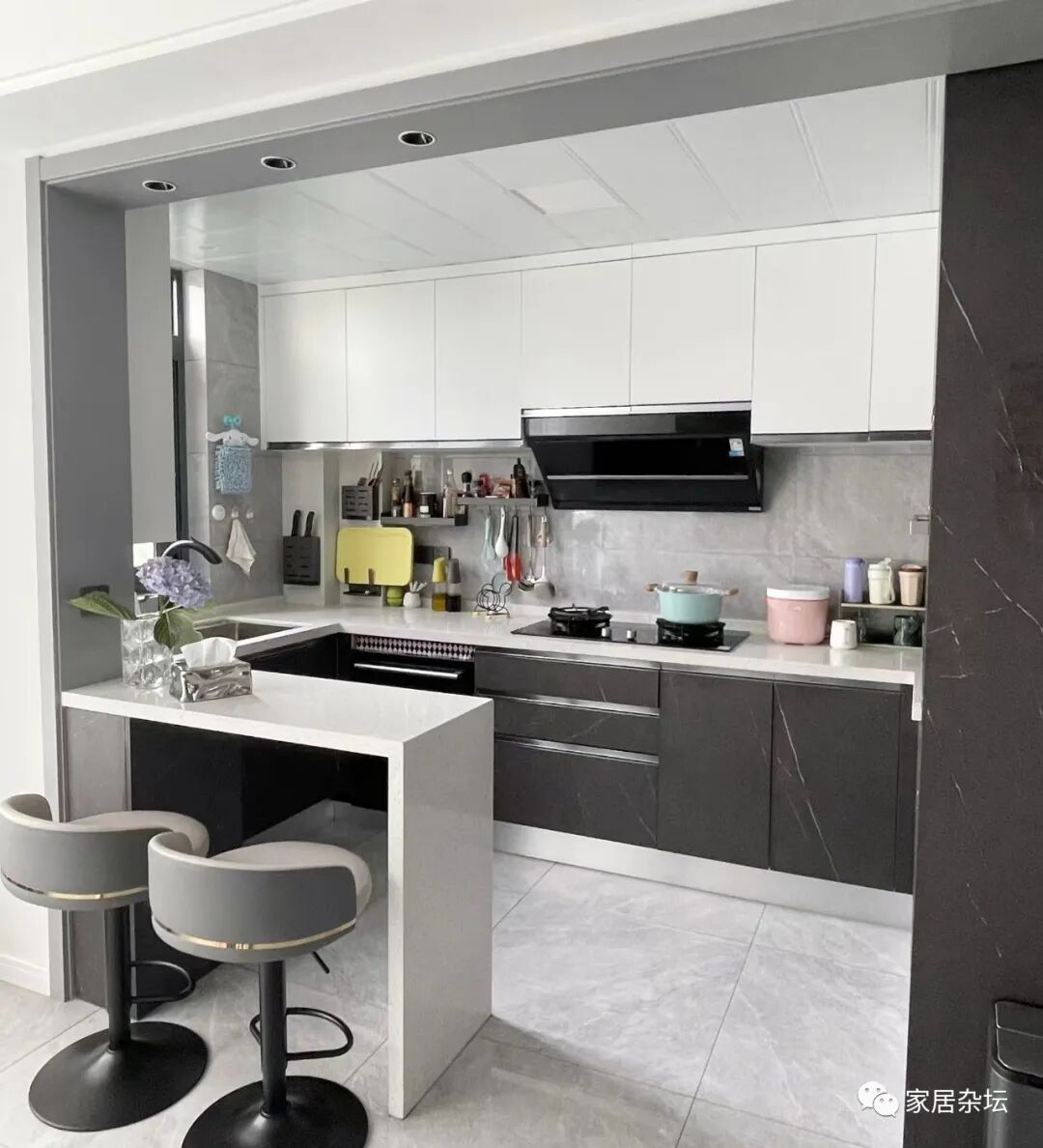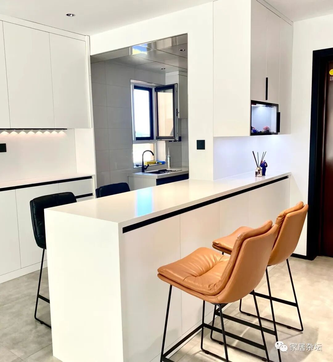 ②、对于厨房,个人认为吧台的作用不是很大。吧台,只是一开始好看,用几天你就烦了,所以更建议大家设计传统的餐桌。空间小,可以设计隐藏式的餐桌。