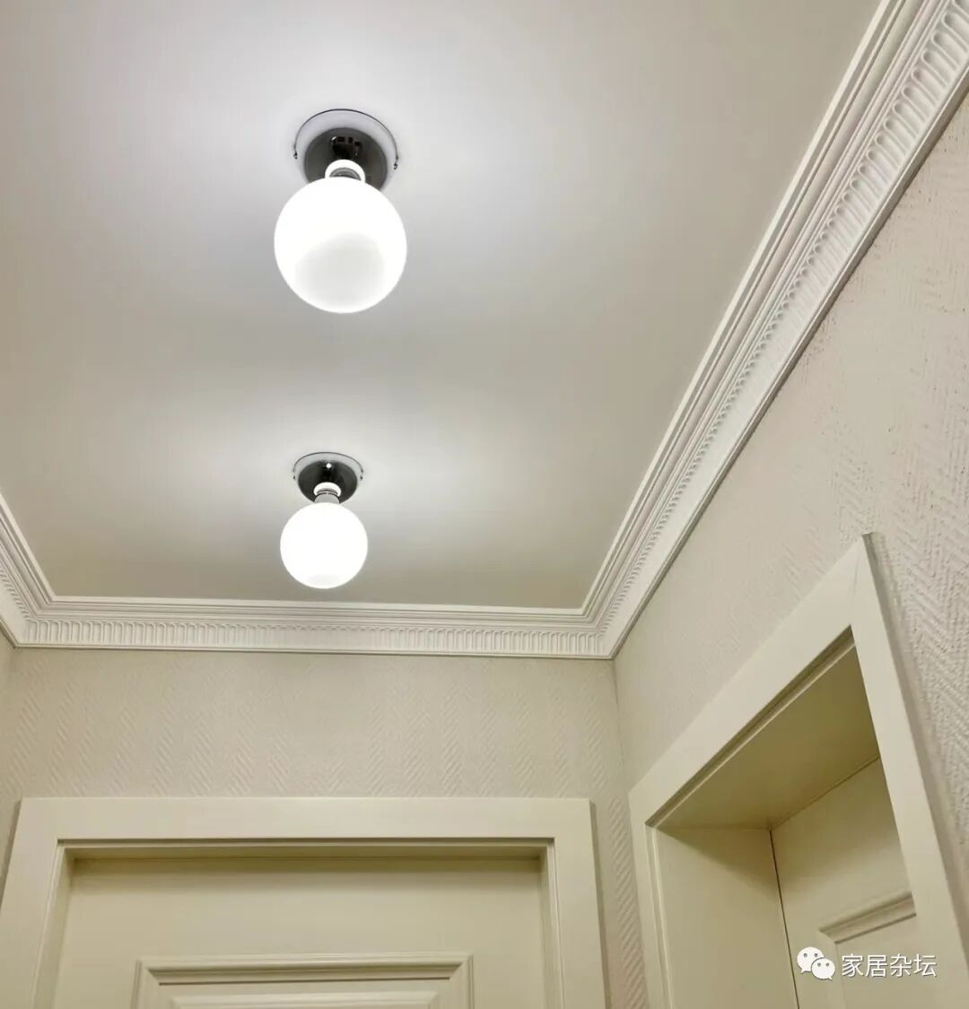 ②、如果从耐用的角度考虑,其实可以考虑不安装石膏线或者是其他的一些装饰。只是使用原顶板,刷好乳胶漆,做出线条的感觉,同样也很好看。