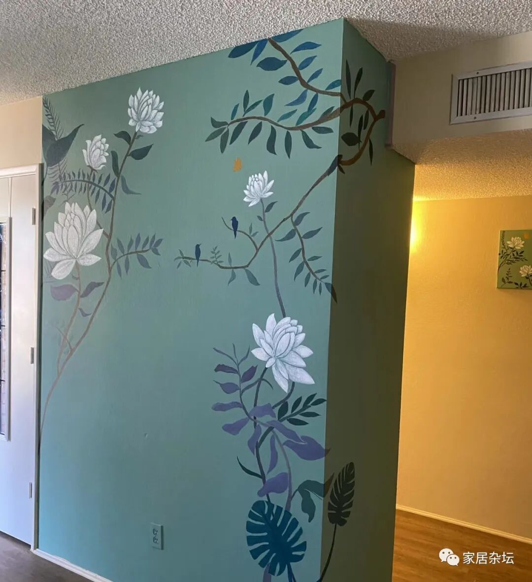最后在家里的客厅墙面,卧室墙面等位置做上了一些特殊的团。例如有一些山水画,有一些艺术画等等。