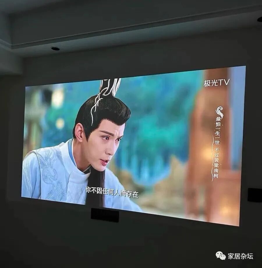①、让客厅显得更简洁,更明了。因为投影仪只是安装了一块抗光幕布,所以整体更加的宽敞,亮堂。