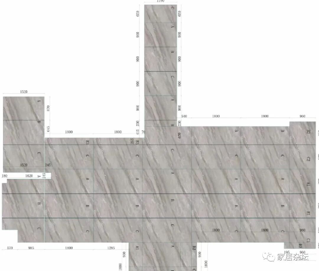 ②、合理排版,选择合适尺寸的地砖。例如根据我们的排版,选择800×800mm的,还是600×1200mm的,或者是750×1500mm的。