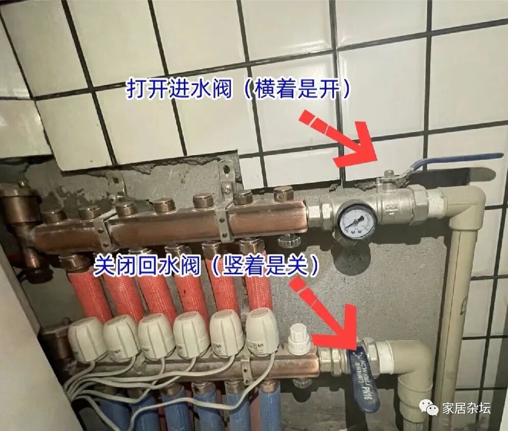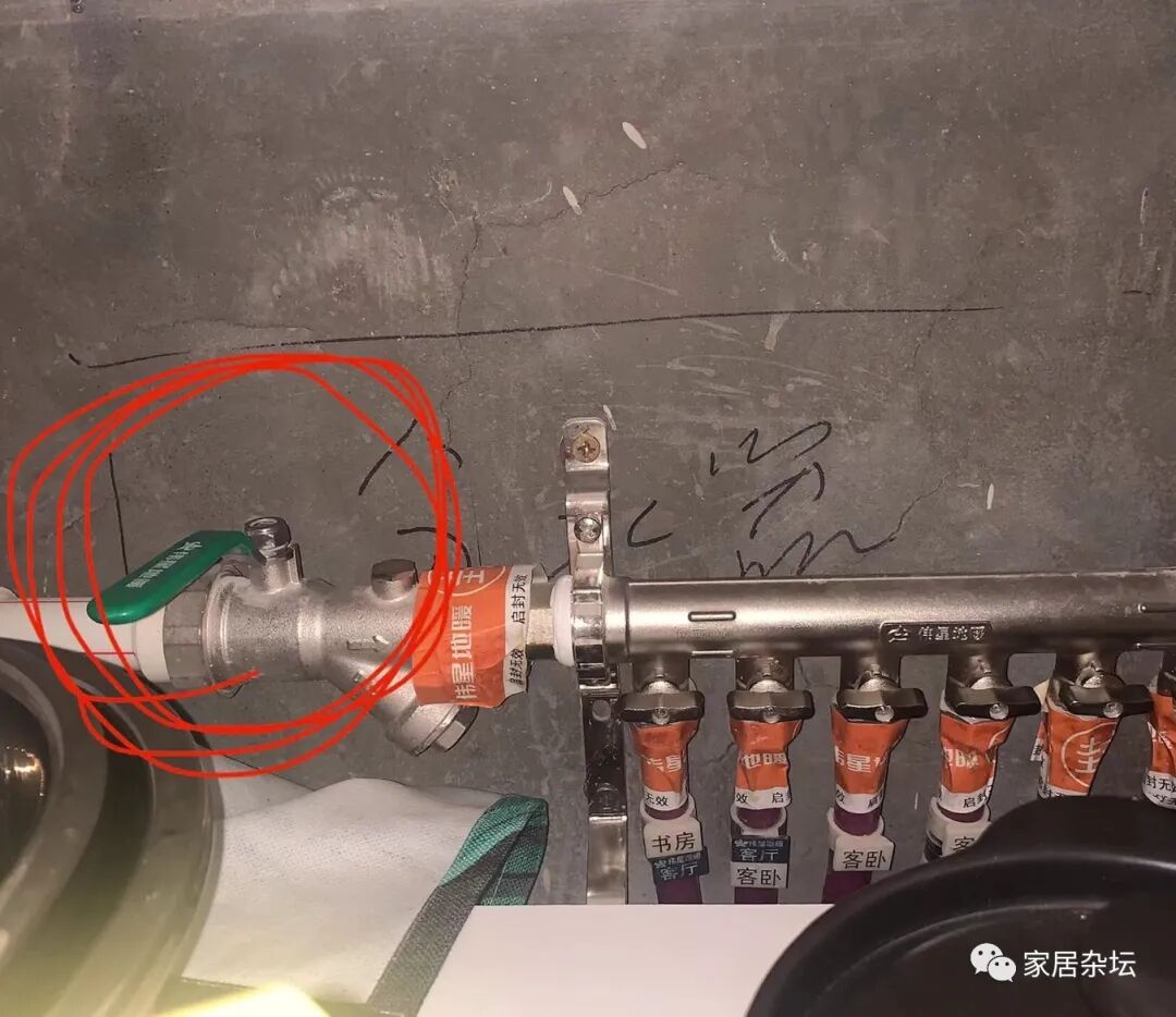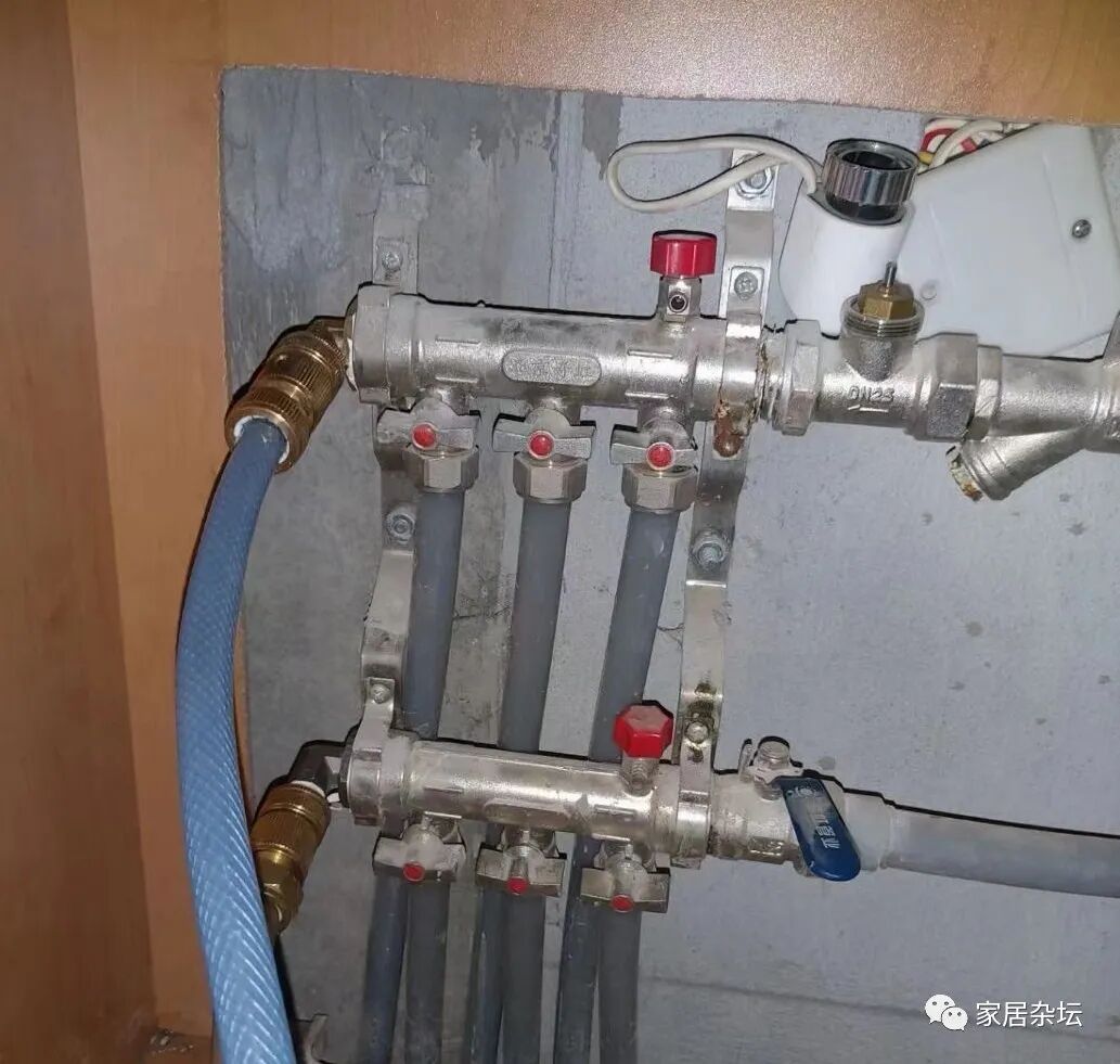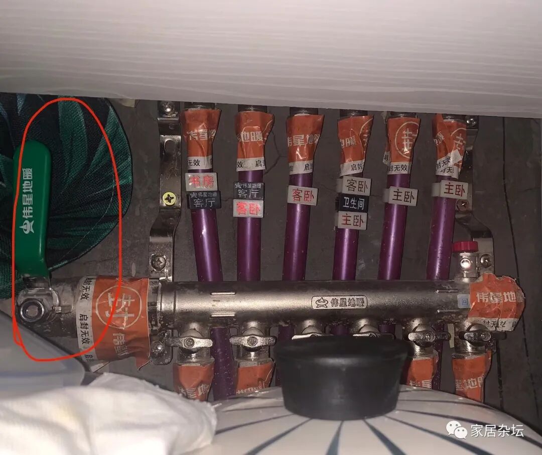 ②、如果室内有入户的总阀门,可以关室内总阀门。例如地暖分水器上面有总阀门,可以关闭这个阀门。