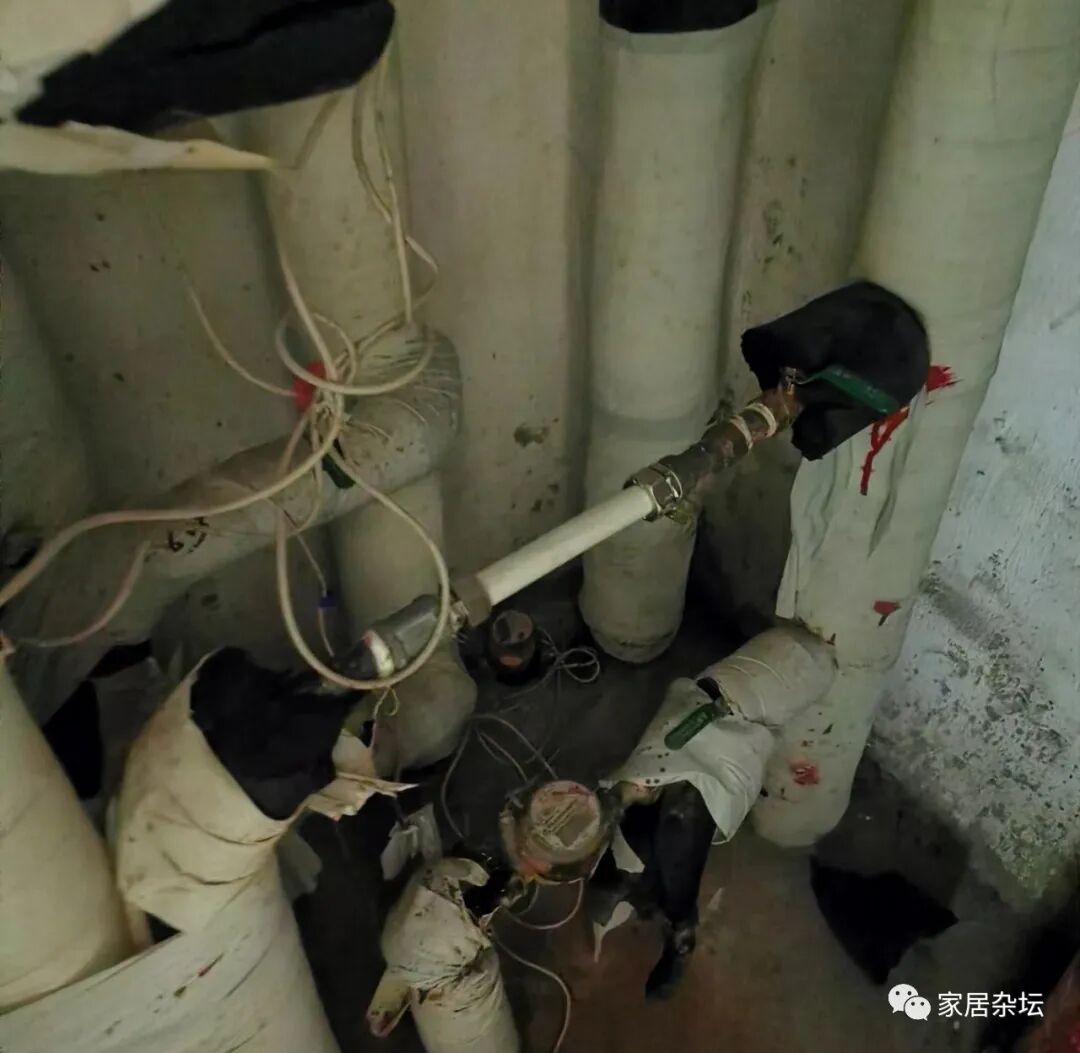 ①、首先建议大家关闭入户供水上的总阀门。如果是在室外管井内,先关上面那根管道上的阀门。因为一般是上供下回。
