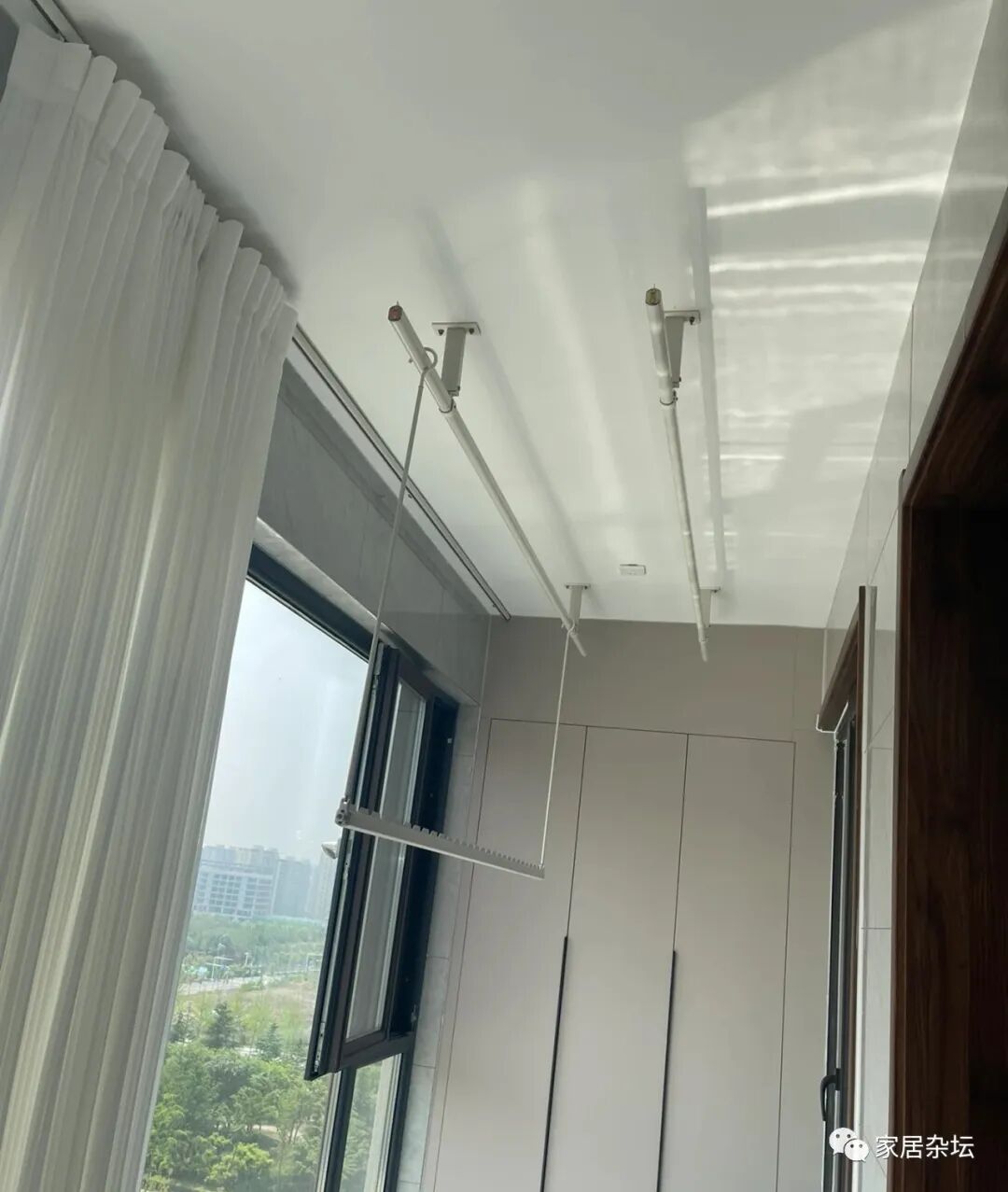 ①、家庭装修,尽量在阳台顶板上安装晾衣架。比如目前比较常用的电动晾衣架,还是非常不错的,。采取嵌入式安装,效果也很好。