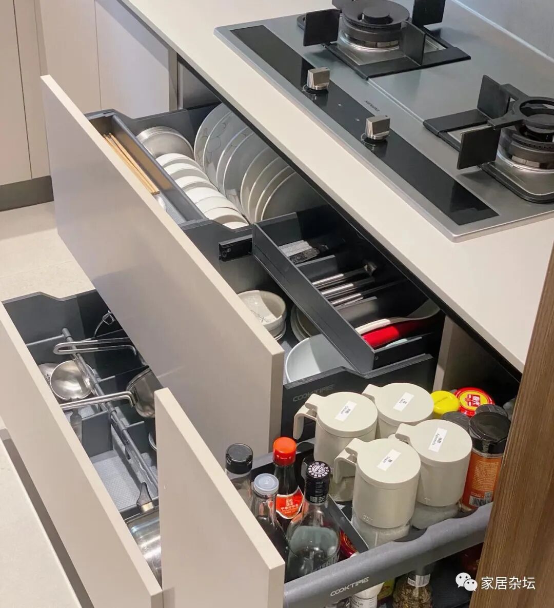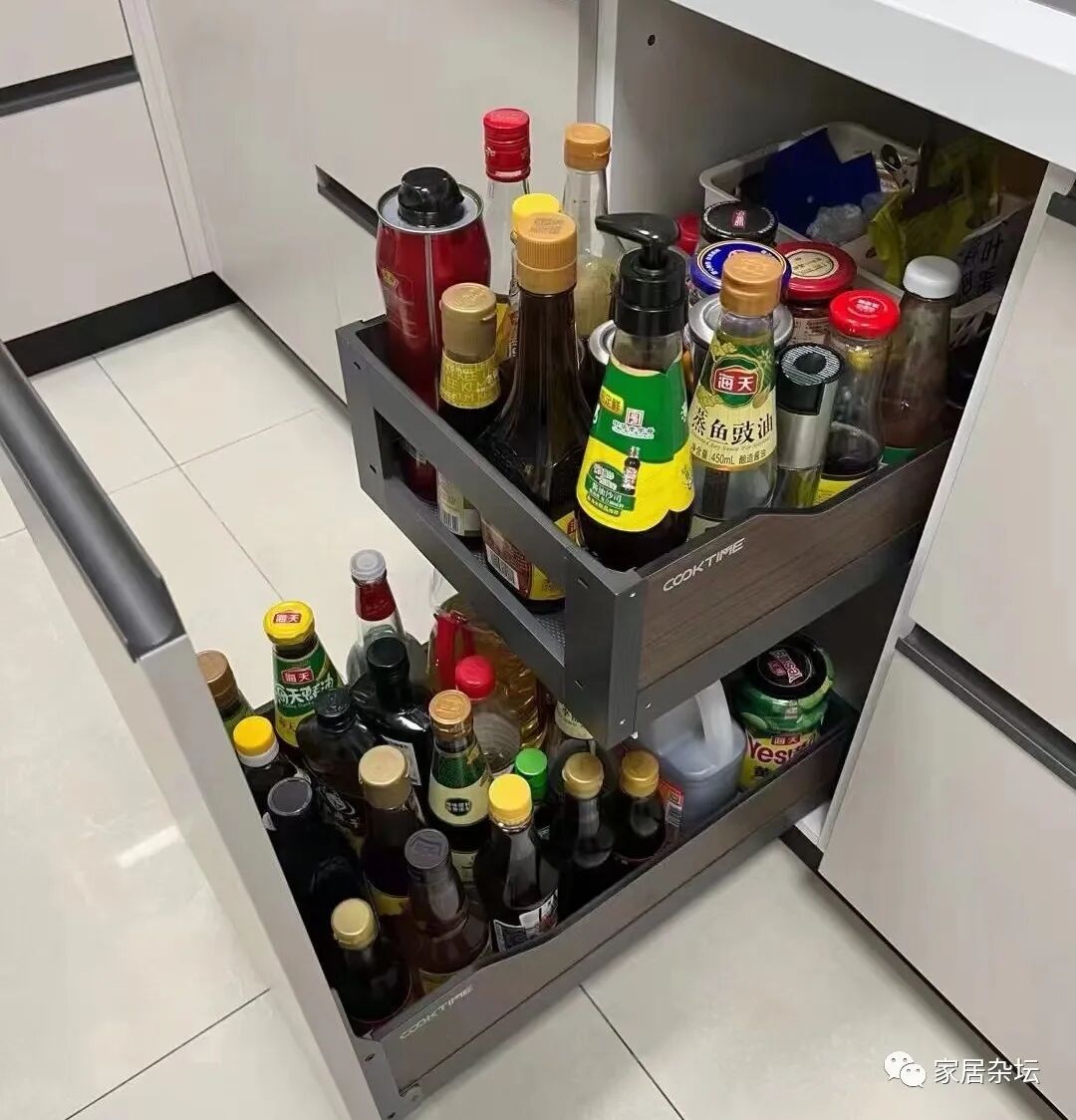 虽然,我们可以把这些调味调料罐放在拉篮里,看着厨房很整洁,但是你真正用的时候,就会感觉非常的麻烦。