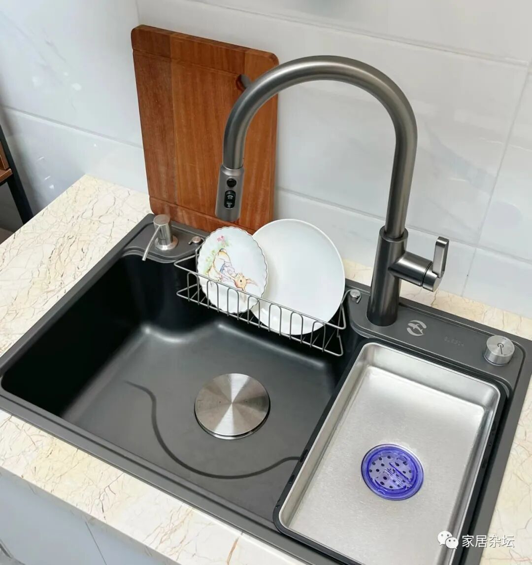 ②、其实对于大多数家庭来说,更建议大家在水槽上安装一个排水的吊篮。不仅可以把洗完的碟子碗放在上面沥水,而且其他的物品也可以,关键是不容易滋生细菌。