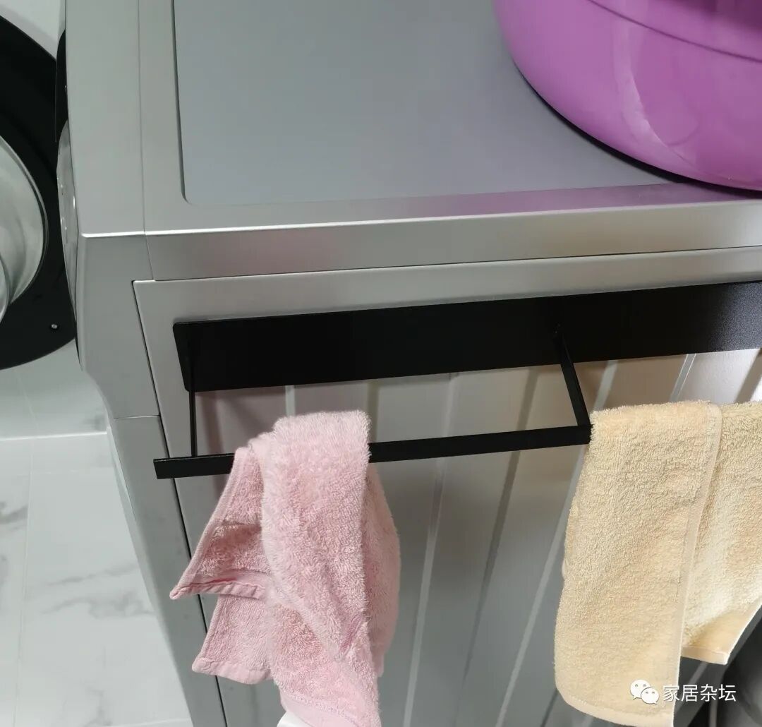 ①、对于洗衣机旁边收纳,其实个人建议大家安装一个收纳架。现在的收纳架,可以依靠自身的磁铁粘在洗衣机上,这样放物品反而更好。