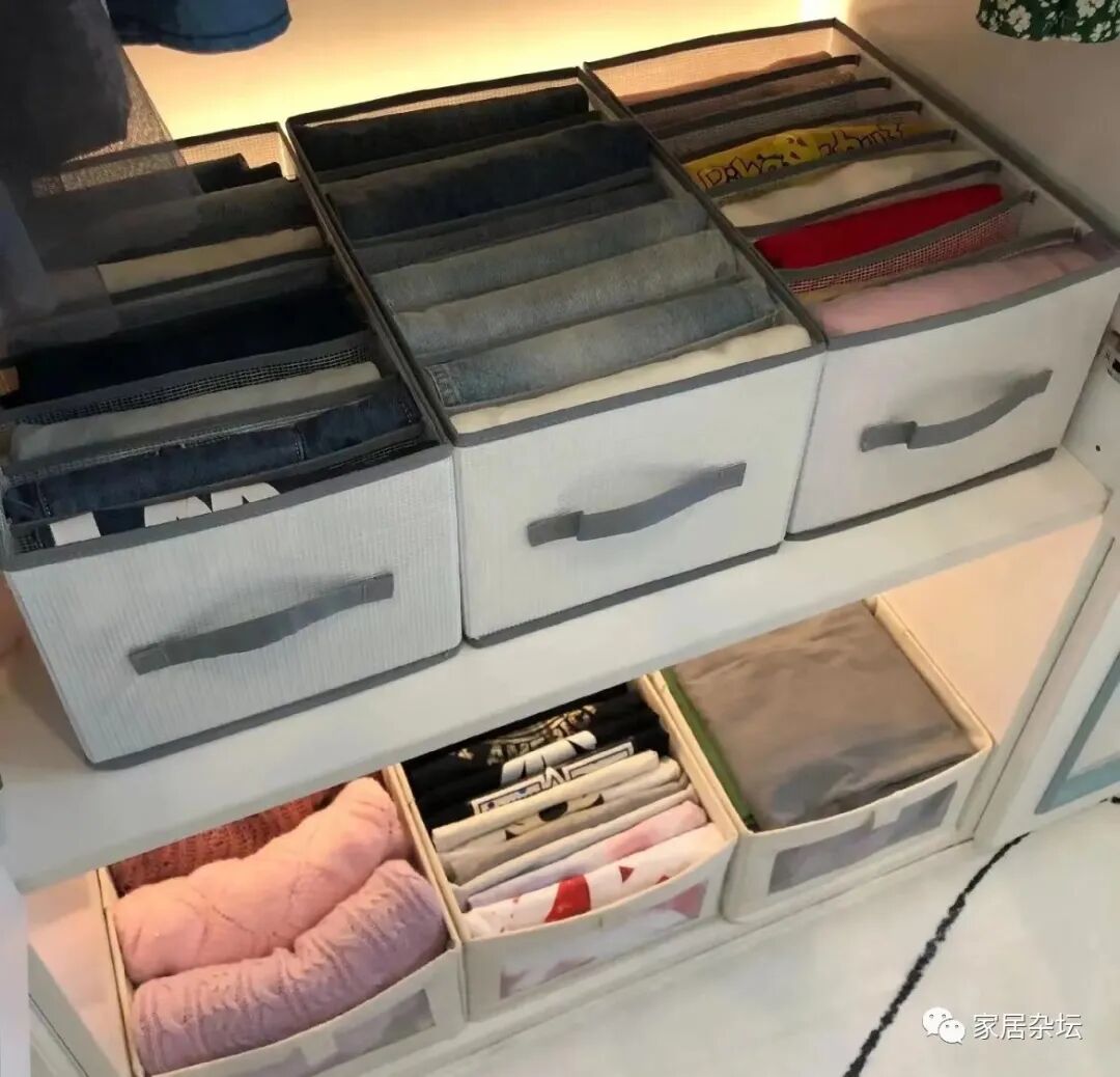 ①、对于我们家里需要收纳的一些衣服,建议大家买一些收纳盒。收纳盒的尺寸尽量与衣柜相同,这样就可以把衣服叠在里面,码在衣柜里。