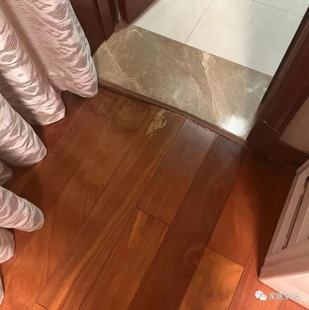 ④、变形,也是木地板另外一个突出的特点。木地板受潮,或有水以后,你会发现木地板变形了,最常见的就是拱起来了。
