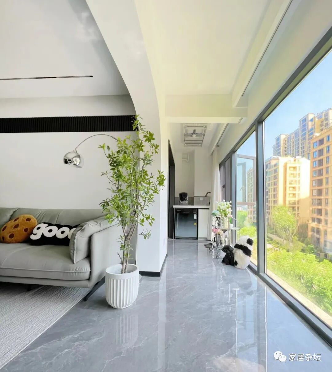 ①、阳台从客厅通铺瓷砖。也就是我们装修的时候,在地面铺瓷砖,从客厅一直通铺到阳台。通透,大气,还利于打扫卫生。