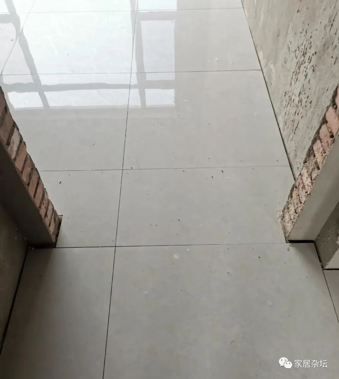 ①、门口的位置。由于门口的位置实现两个房间的跨度,如果瓷砖处理不好,确实会容易出现非整砖。常出现的有瓷砖细条或者是小块瓷砖。