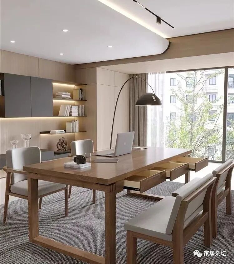 ②、书桌和餐桌共用。如果我们家里的客厅餐厅比较小,那么就可以把这个区域规划成学习和就餐的区域,效果也是不错。