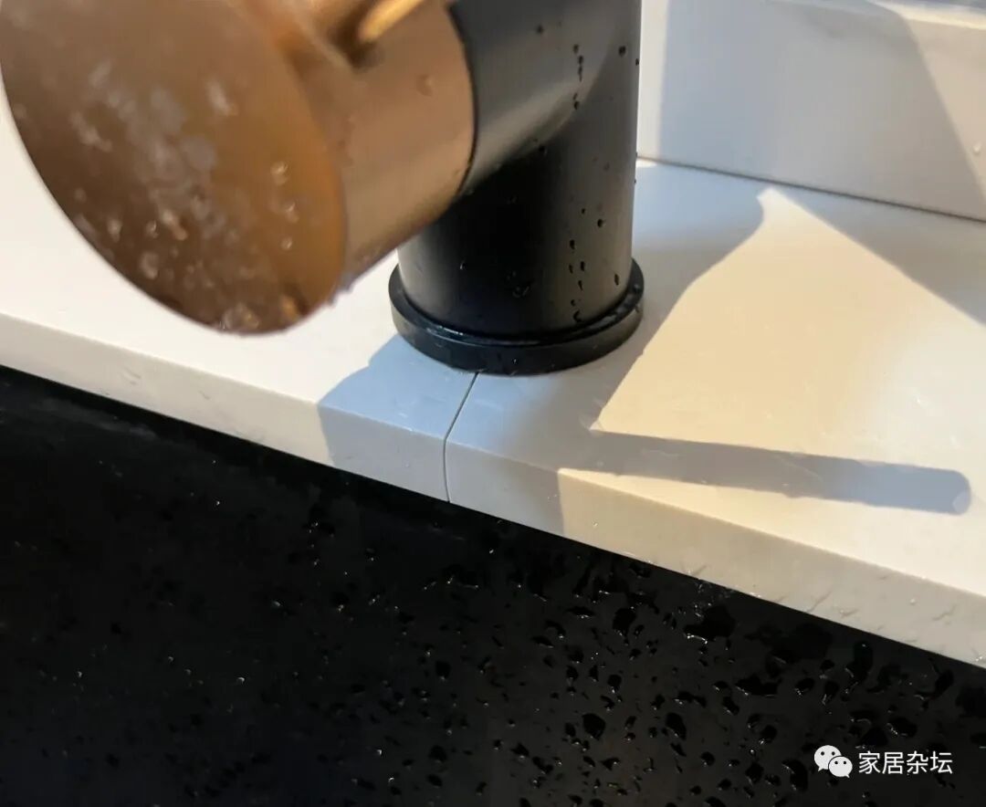 ①、岩板之间出现了缝隙。这个缝隙是出在平面和侧面之间的,最终是使用胶弥补的,其实自己看很明显。