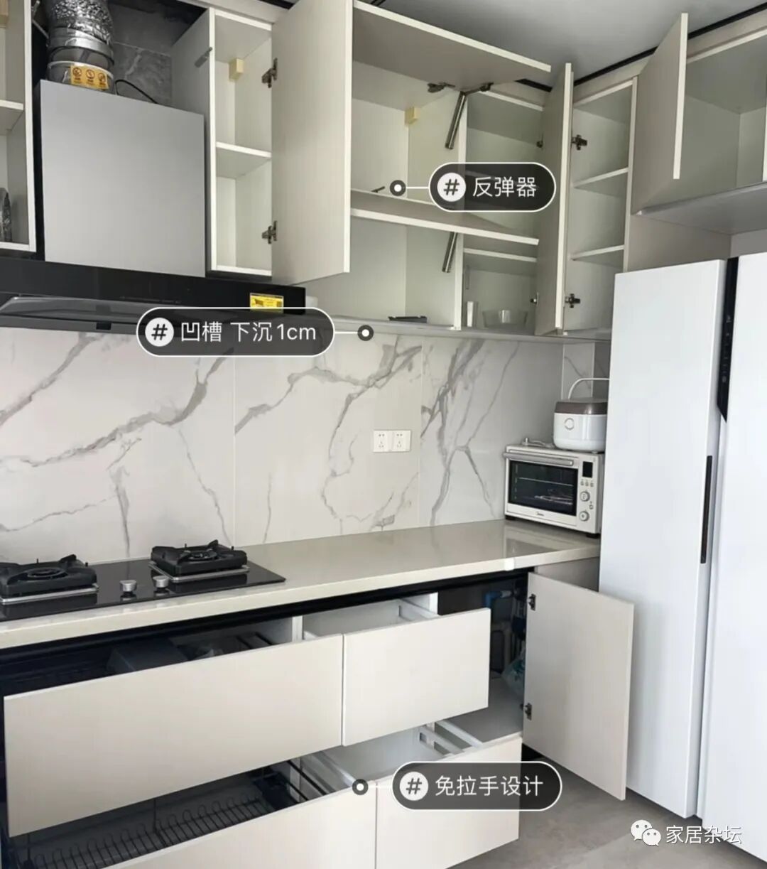 ①、对于家用的厨房的橱柜,建议大家尽量选择免把手的橱柜。像现在很多都是使用阻尼来代替了传统的橱柜把手,大都很好用。