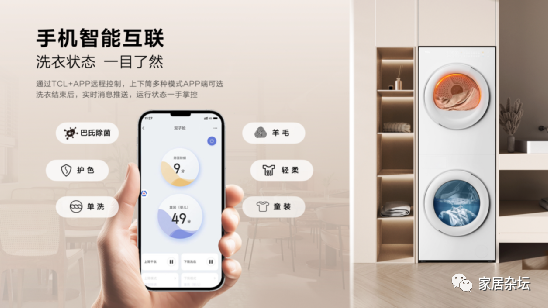除了能在触控屏上操作,双子舱T10洗衣机也支持手机智能交互。用户利用手机里TCL的APP即可远程选择多种洗烘护功能,出门前将衣物放入烘干筒,出门在外也能随时遥控清洗烘干。在万物互联时代大背景下,这一功能也让消费者进一步释放双手,感受智能科技为生活带来的便利。