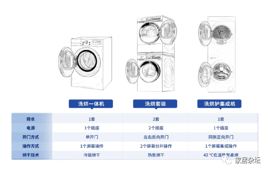 而洗烘套装、洗烘集成机均采用热泵式烘干,从周围环境中吸收热量传递至需烘干的衣物,其工作原理与空调机类似。尽管都采用热泵烘干,但洗烘集成机不需要像一些洗烘套装那样准备两套排水和接电,安装更加便利。