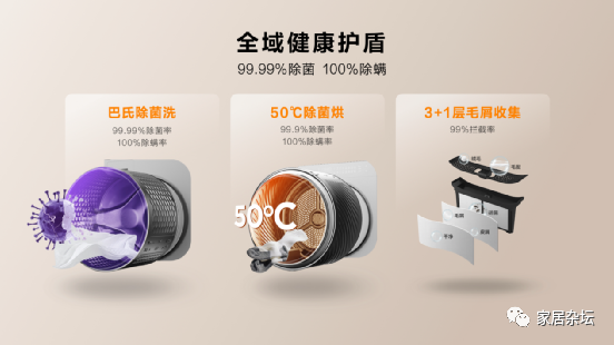 除热泵智能变温技术外,双子舱T10洗衣机在“洗”“护”上也不乏亮点。它配备了360°智能正反转、巴氏除菌洗和3+1层毛屑收集,在减少衣物褶皱、打结的同时,能达到99.99%除菌率,100%除螨率,99%拦截率,营造洁净空间,全方位守护用户和家人的健康。因此,即便面对有娃、养宠物家庭提出的更高阶洁净洗护需求,双子舱T10洗衣机也能轻松应对。