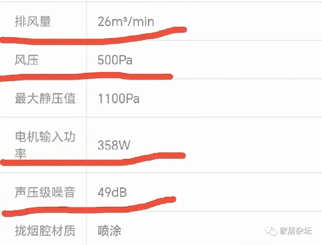 ②、这里还要注意一点,就是在油烟机的品牌上,一般要有噪音值。这一点,大家一定要会看,如果大于65分贝,甚至有的达到了70分贝,就不要选了。