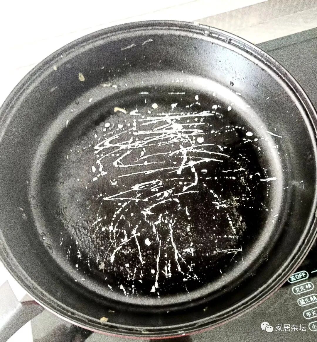 ①、锅底糊了以后,特别难清洁。就像上面所说的,煎个鸡蛋锅底糊了。于是就发现这些糊了的锅底,粘在不粘锅底下清不掉,因为我们还不敢用铁爆花。
