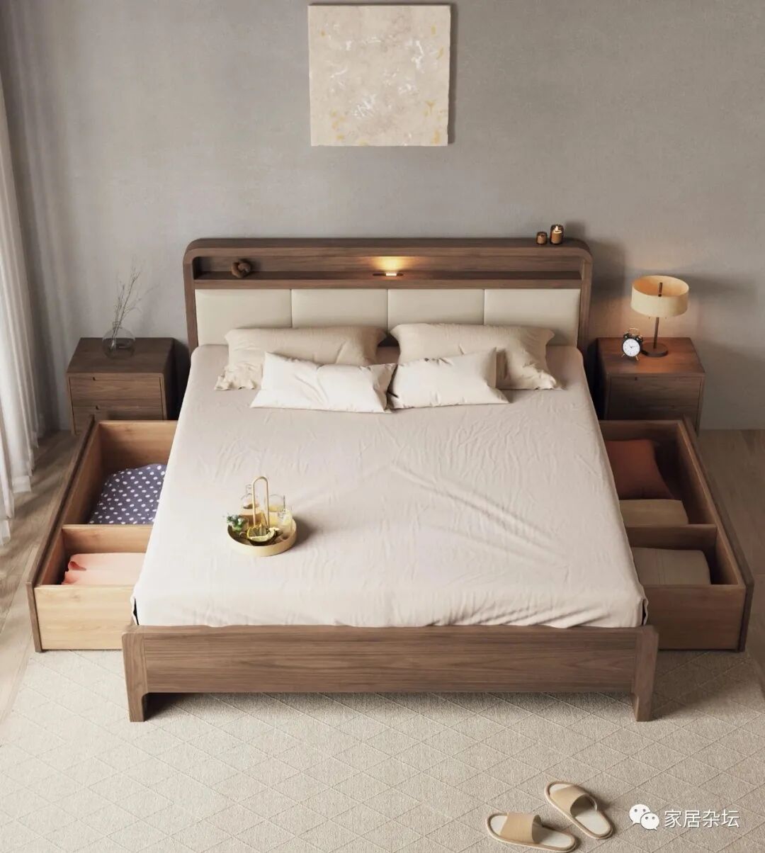 而带有抽屉的床,就可以从侧面把抽屉打开,往里面存放物品。