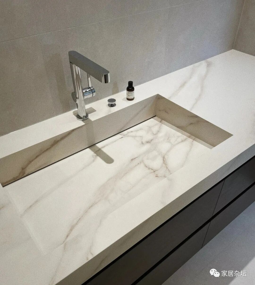 ②、如果大家喜欢岩板,可以考虑台面是岩板的,但是下面全部是陶瓷的。说白了就是岩板的台面,加上陶瓷的盆体。但是,一定要注意加固方式,不能选只是胶粘的。
