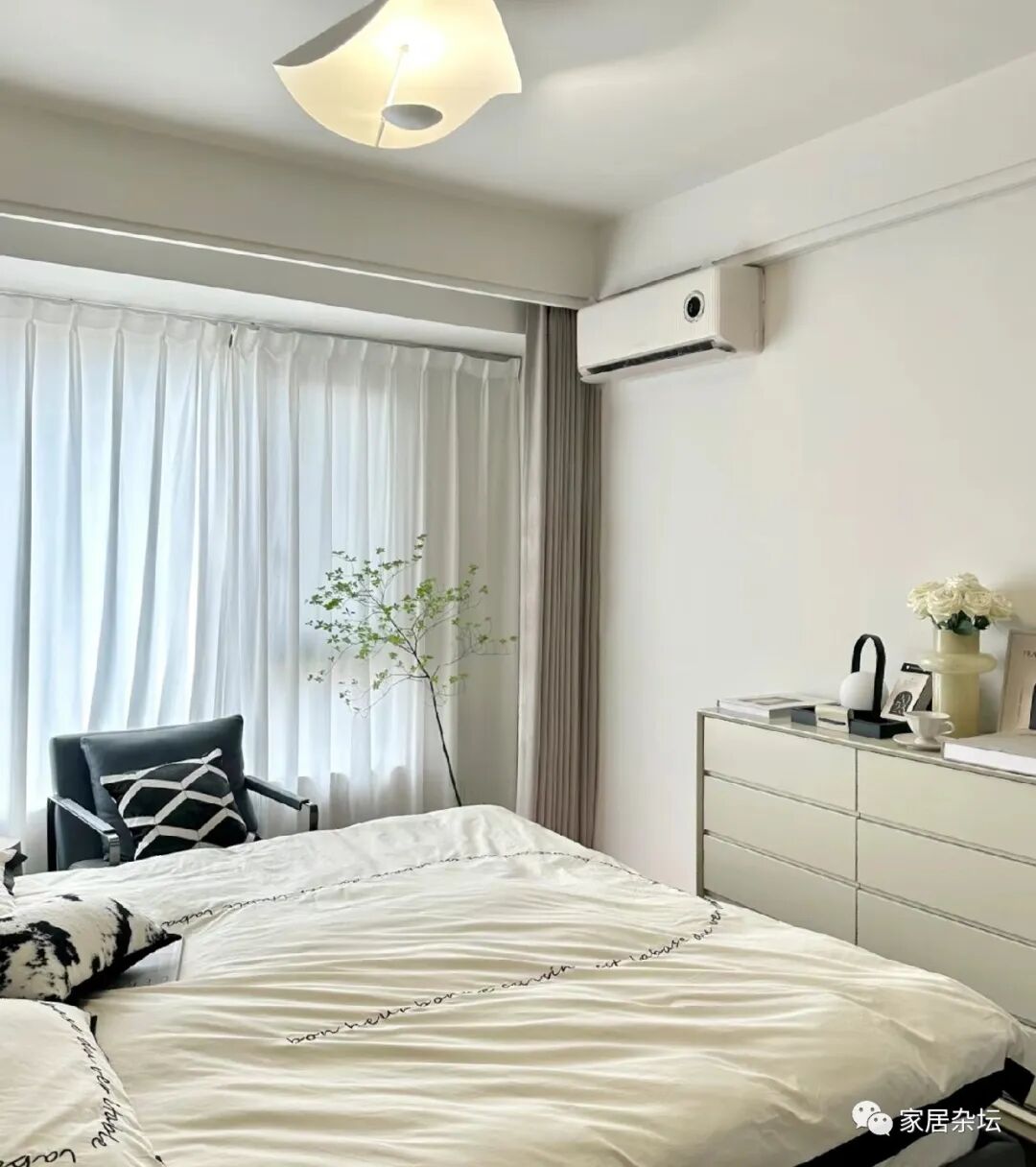 ①、对于卧室或者是书房的壁挂式空调而言,个人建议大家直接就是挂墙安装,而不要嵌在柜子里。安装的位置尽量在床头的侧边,避开直吹床的位置。