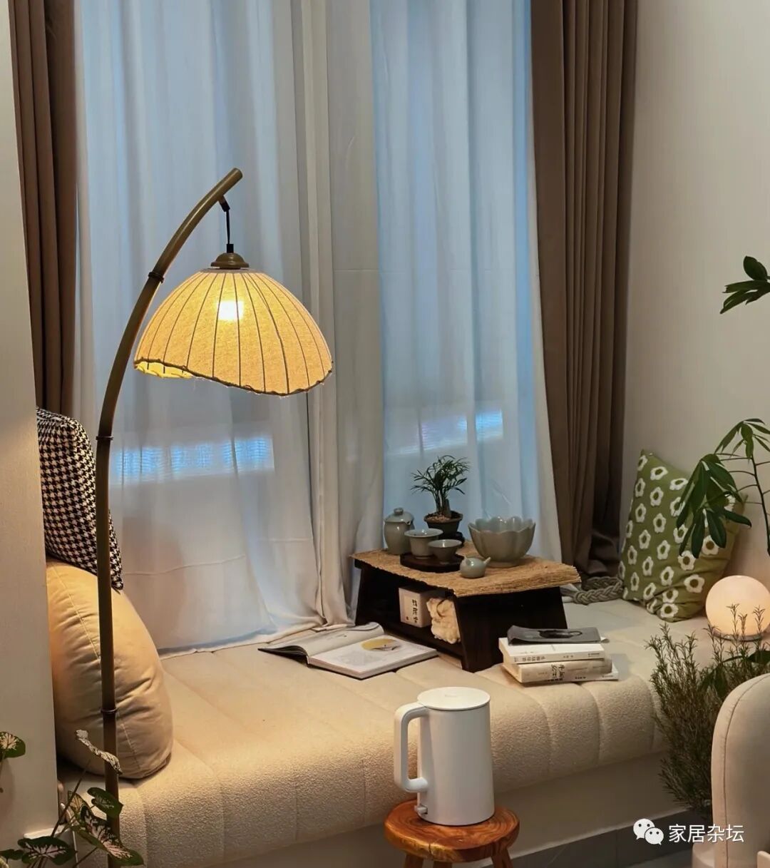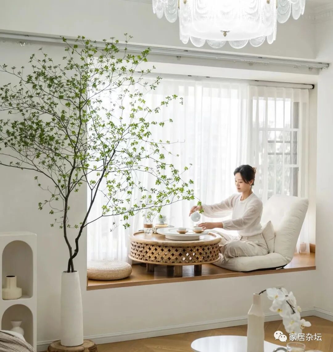 ①、设计成品茶区。做法也很简单,只需要在飘窗上面设计一个小的茶桌,然后摆上茶具。这时要注意在飘窗旁边要预留一个插座,这样用起来会更好用。