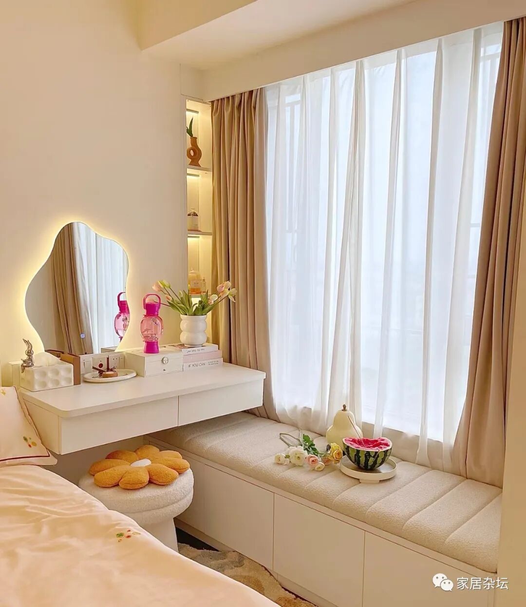 因为飘窗作为化妆台的使用,具有以下的好处: