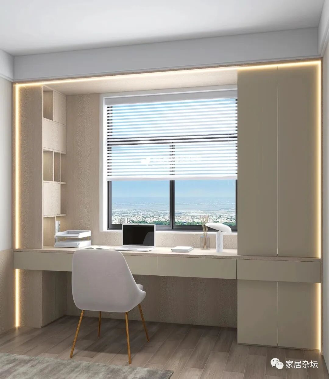飘窗的装修,还有一种方案,就是可以采取书桌+书柜。